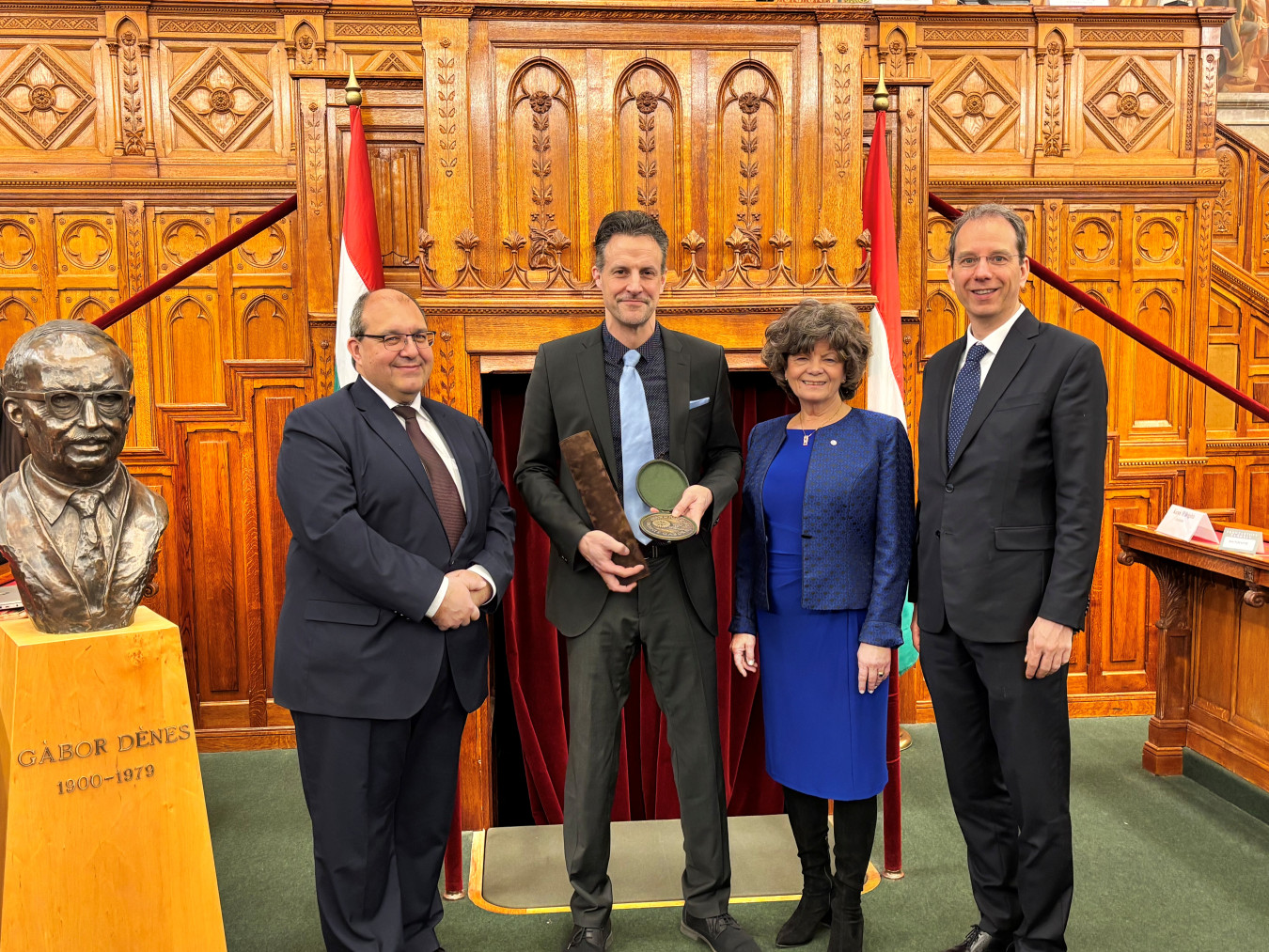 (На фото: доктор Міклош Бендзель, президент ради піклувальників; доктор Пал Фекете, лауреат премії за життєві досягнення; доктор Балаж Гуяш, президент Угорської мережі досліджень HUN-REN. Фото: Dennis Gábor Award, Novofer Foundation)